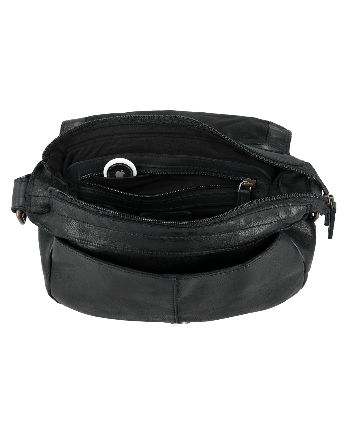 Den lilla handväskan "Aliya" är en svart läderhandväska för damer som omedelbart fångar ögat med sin flätade yta. Det tvättade nötläderet känns behagligt mjukt och ger väskan en avslappnad, högkvalitativ utstrålning. "Aliya" är funktionell redan i vardagen: ett dolt AirTag-fack ger extra säkerhet, medan den justerbara axelremmen erbjuder flexibla bärmöjligheter. Kombinationen av magnetlås på framsidan och dragkedja i ett huvudfack förenar komfort med en trygg känsla när du är på språng.