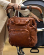 Praktisk brun läder blöjbytar-ryggsäck för föräldrar på språng