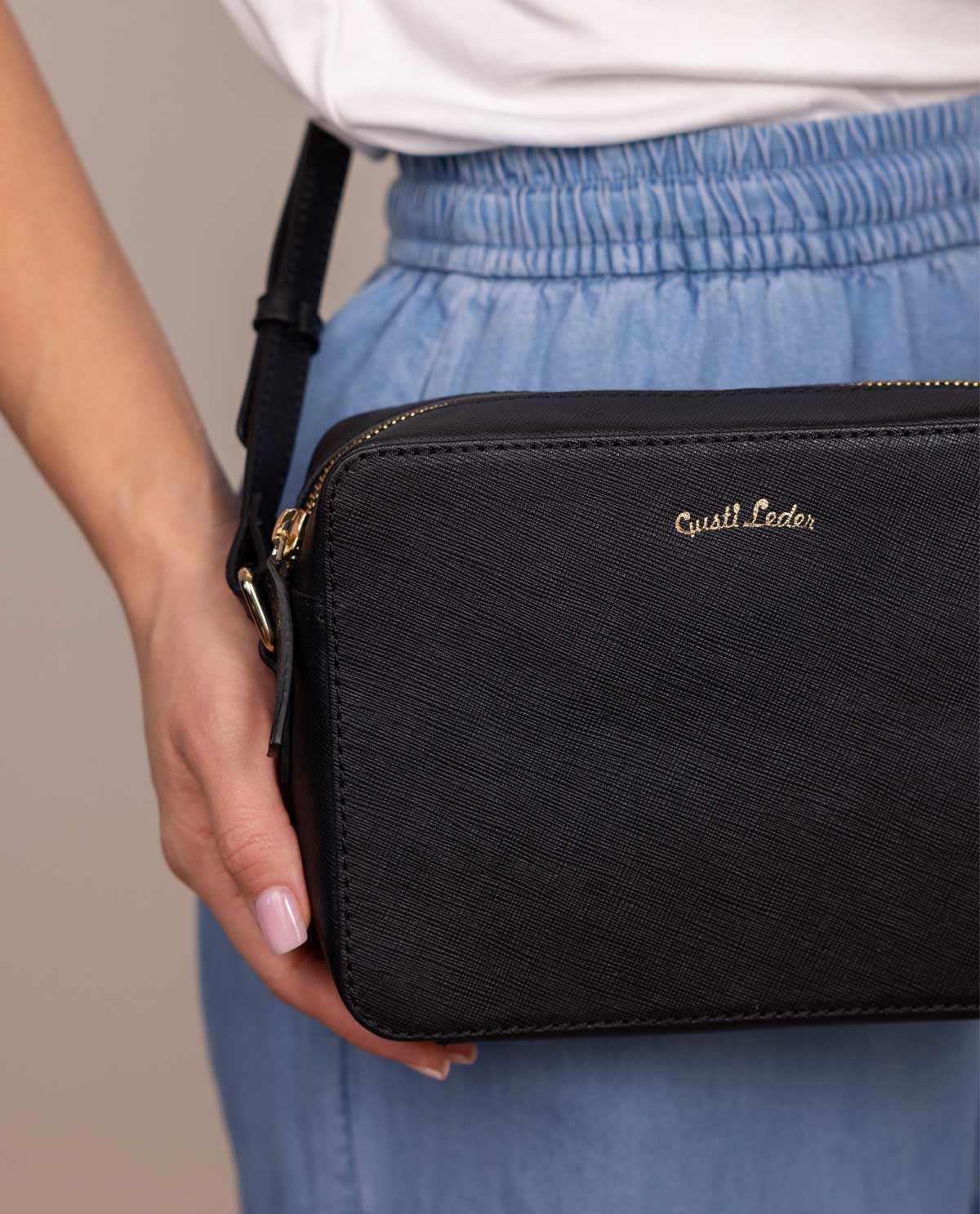 "Almina" är designad i snyggt saffianoläder med riktigt modern och bekväm struktur. Den har et stort huvudfack och försluts med en guldfärgad dragkedja. Pricken över i:et blir den guldfärgade Gusti Läder-loggan.