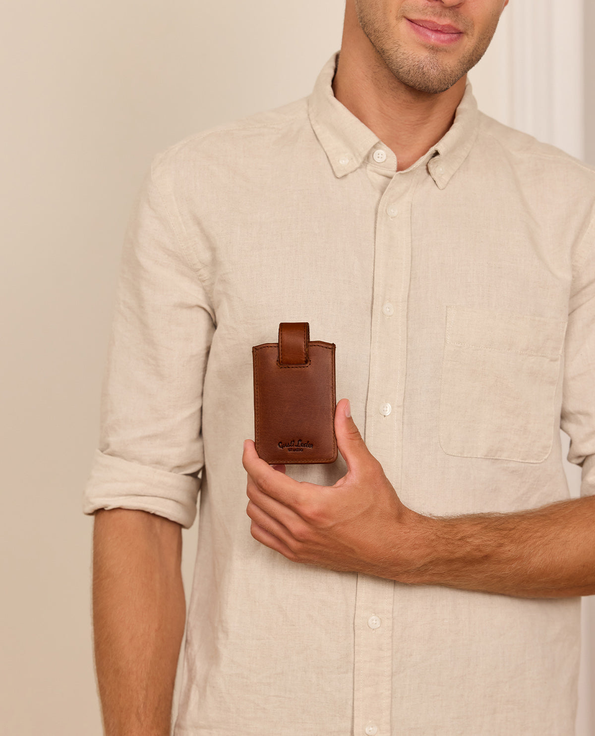 "Cody" kortfodral i högkvalitativt brunt läder är den perfekta lösningen för alla som vill förvara sina kort säkert och stilfullt. Med sin kompakta design erbjuder det plats för dina viktigaste kort – oavsett om det är kreditkort, bankkort eller ID-kort – och ser till att du alltid har allt till hands. Det eleganta utseendet på plånboken och den robusta konstruktionen gör den till en hållbar och elegant följeslagare i vardagen.