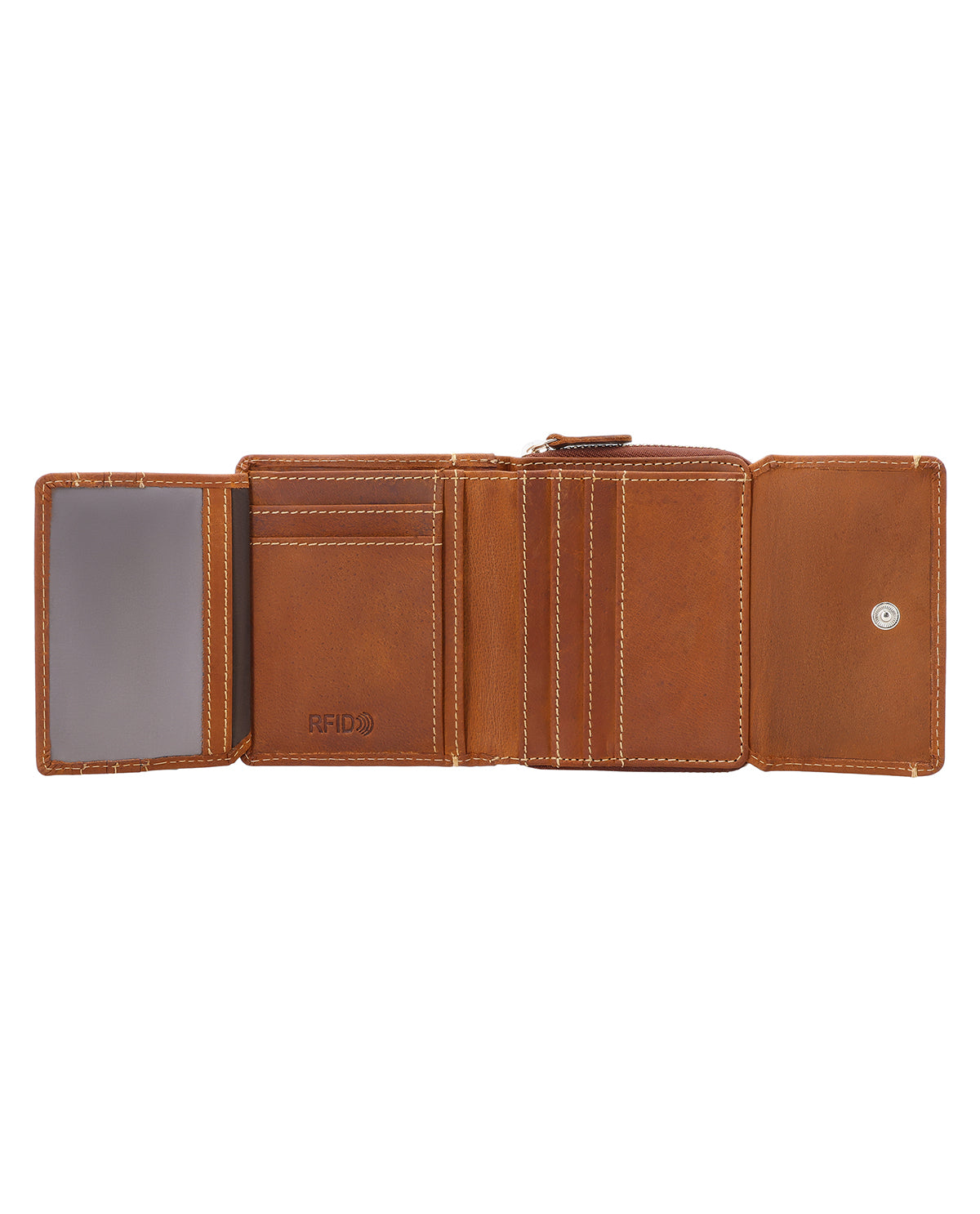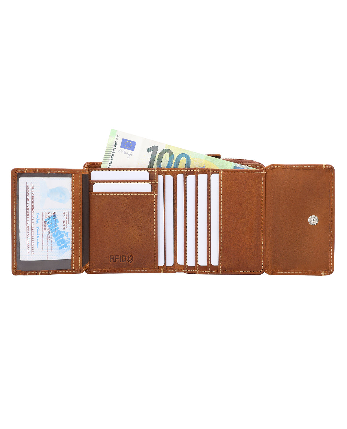 Inuti har ”Brigitta” ett sedelfack, ett utfällbart fönster, plats för upp till sex kort samt ett separat myntfack med dragkedja som förhindrar att mynt faller ut okontrollerat. Plånboken är tillverkad av högkvalitativt buffelläder och stängs säkert med en tryckknapp. Så är du alltid redo för dagen. Den integrerade RFID-blockeraren i plånboken stör signalerna från läsare, skyddar dina kort och ger extra säkerhet.