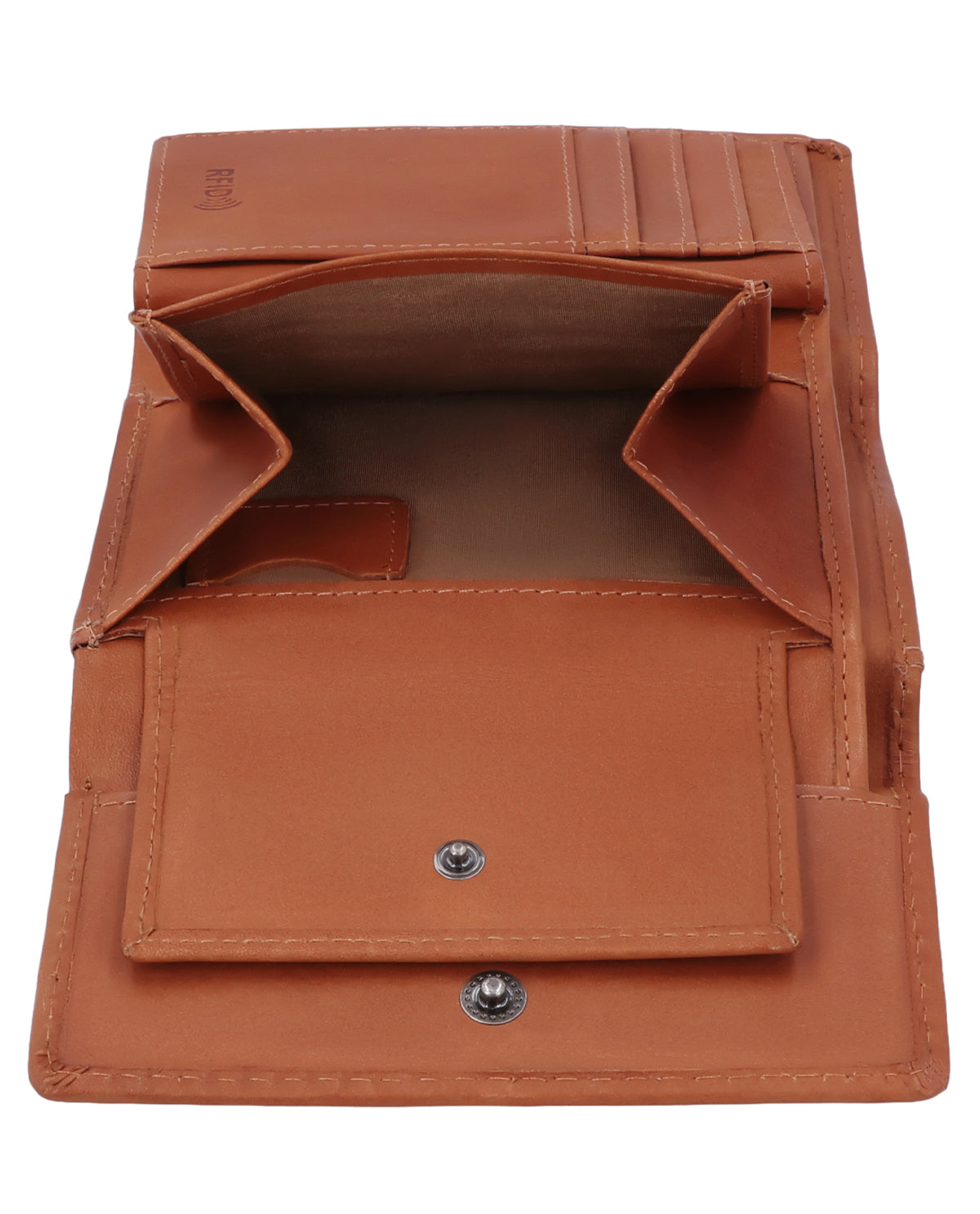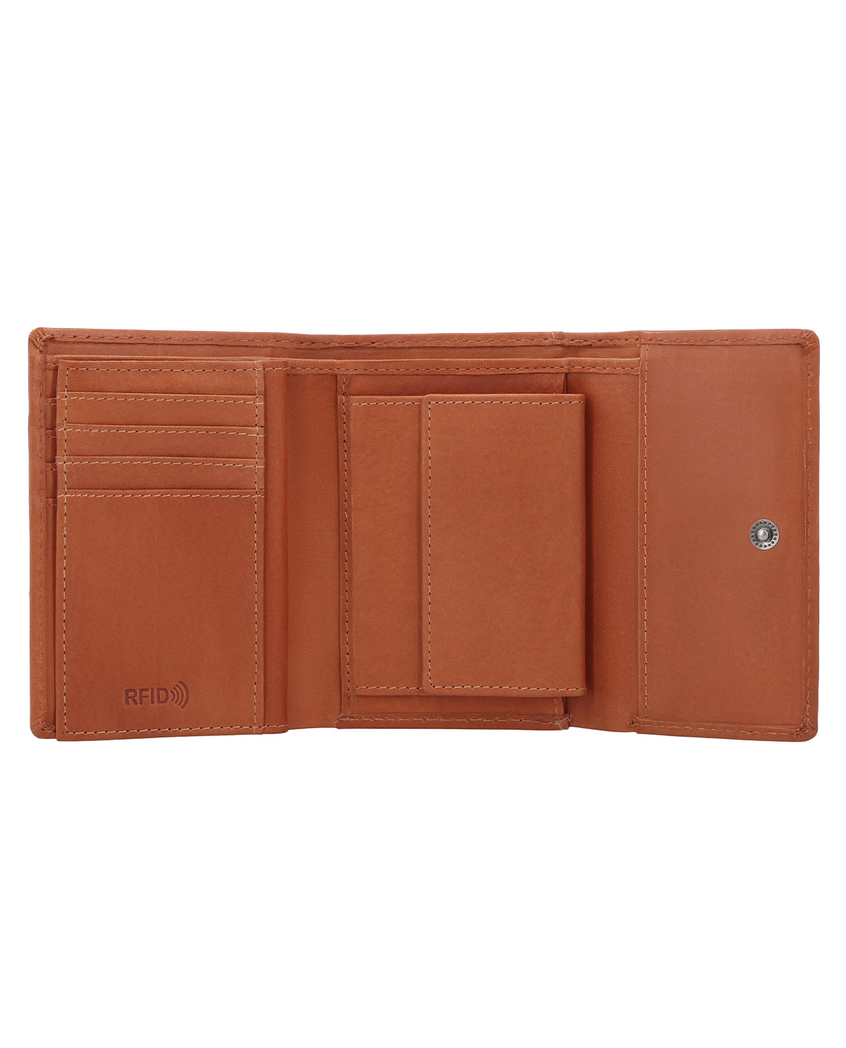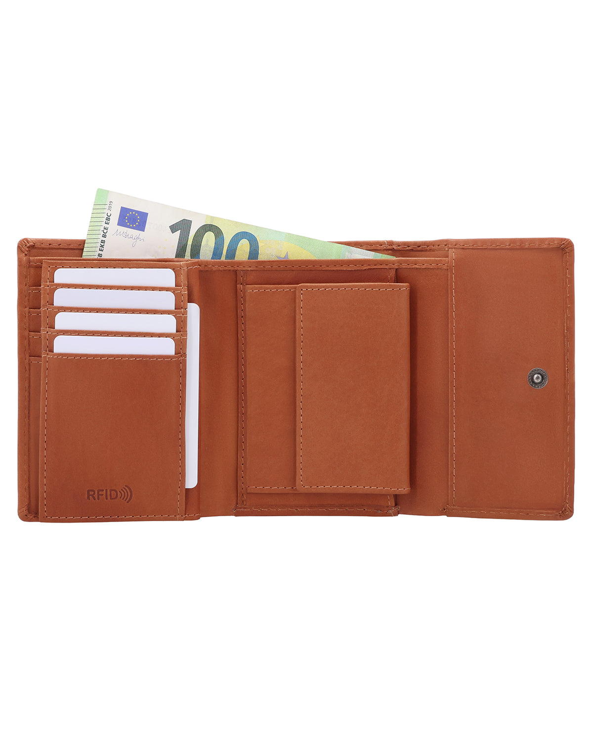 Med "Tessa" är det inte längre något problem att snabbt stoppa undan växelpengarna i kassan. Det tar ju oftast tillräckligt lång tid att packa in varorna. Oavsett om du föredrar att betala med kort eller kontanter: allt är snabbt tillgängligt och lika snabbt tillbaka i plånboken. Vår plånbok är tillverkad av robust nötläder och kan stängas med en tryckknapp. Tack vare integrerat RFID-skydd är dina kort dessutom skyddade mot oönskad avläsning. För de små vardagliga ögonblicken finns det också ett extra myntfack för en enda mynt – perfekt när du snabbt vill ha en passande mynt till hands. Logotypen är präglad på utsidan och ger "Tessa" ett ännu mer exklusivt, rent utseende. På baksidan finns till och med ett extra fack för till exempel biljetter, så du behöver inte leta länge i tåget när konduktören kommer förbi. Dessutom hittar du din biljett direkt och tanken "Hjälp, jag har tappat bort min biljett" är äntligen ett minne blott!