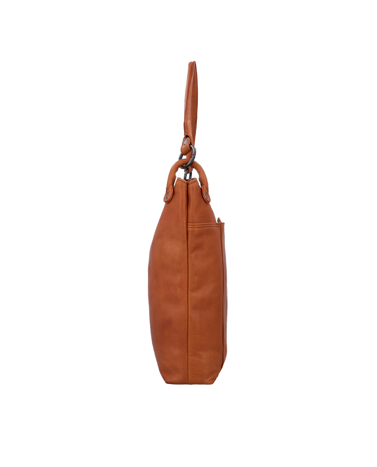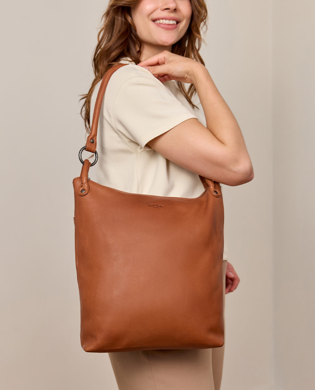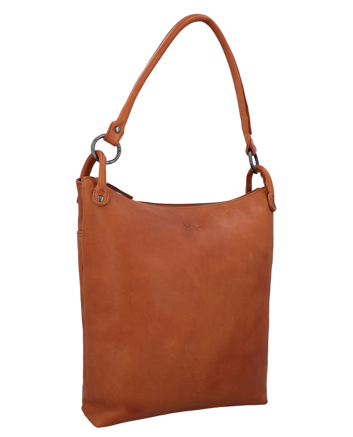 "Cathy" Shopper är den perfekta blandningen av praktisk funktionalitet och elegant design. Tillverkad av högkvalitativt brunt läder, imponerar den med robusta, runda handtag som förstärks av metallringar och har X-sydda läderdetaljer. Dragkedjan med läderhandtag säkerställer att dina personliga tillhörigheter alltid är säkra och skyddade. Det rymliga innerfacket, som är fodrat med slitstarkt bomullstyg, erbjuder tillräckligt med plats för allt du behöver i vardagen.