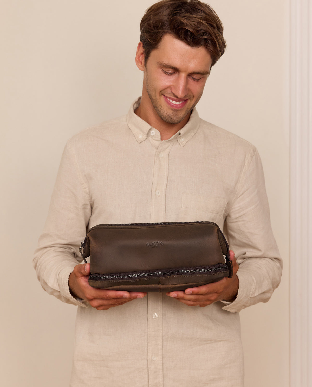 Der "Quinn" Kulturbeutel bringt Ordnung und Eleganz in Deine Reiseutensilien. Aus hochwertigem Leder gefertigt, kombiniert er zeitloses Design mit funktionaler Ausstattung. Ob für einen kurzen Wochenendausflug oder eine lange Reise – "Quinn" sorgt dafür, dass Deine Pflegeprodukte sicher und stilvoll verstaut sind.