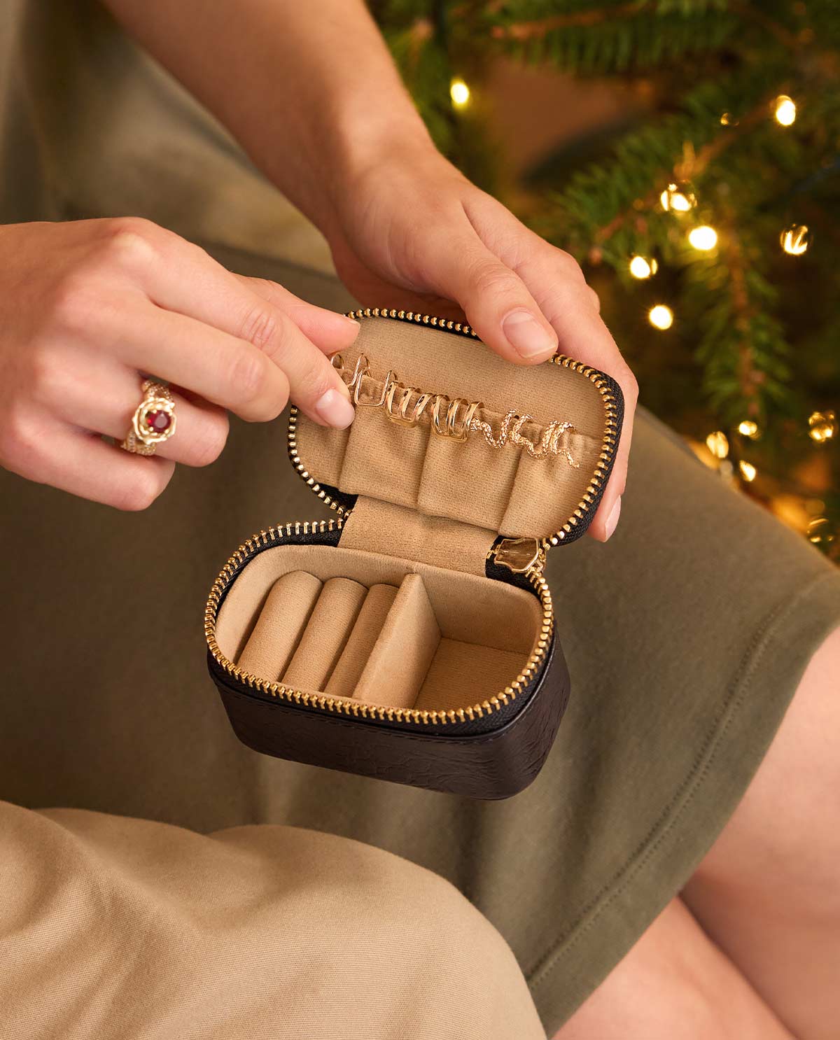 Die weichen Innenfächer von "Levke" bieten Dir genügend Platz, um Ketten, Ohrringe und Ringe sorgfältig zu sortieren. Dank der separaten Slots bleiben Deine Schmuckstücke an Ort und Stelle und sind jederzeit leicht zugänglich. So kannst Du Dich darauf verlassen, dass nichts verheddert oder beschädigt wird.
