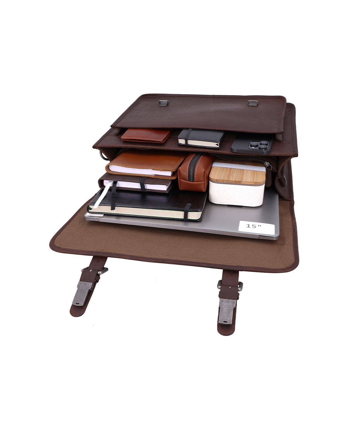 So bietet "Elmar" und sein großzügiges, mittig geteiltes Hauptfach ohne Probleme Platz für DIN A4-Aktenordner und Dokumentenmappen jeglicher Art ebenso wie der Terminkalender, Schreibutensilien, das Lunch-Paket, eine kleine Trinkflasche u.v.m. Technische Geräte bis zu einer Größe von 15" finden unterdessen Platz in einem eigens ins Taschendesign integrierten Laptopfach. Auch das mittig eingefügte Reißverschlussfach sowie die diversen Steckfächer und das aufgesetzte Fach an der Vorderseite von "Elmar" bieten zudem die Möglichkeit, kleinere Habseligkeiten griffbereit zu verstauen, ohne lang nach ihnen suchen zu müssen. Der längenverstellbare und abnehmbare Schulterriemen ermöglicht es Dir dabei, "Elmar" ideal an Deine individuellen Tragegewohnheiten anzupassen, während zwei Schnappverschlüsse in Dornschnallen-Optik dafür sorgen, dass unterwegs alles vor Staub und Feuchtigkeit geschützt ist.