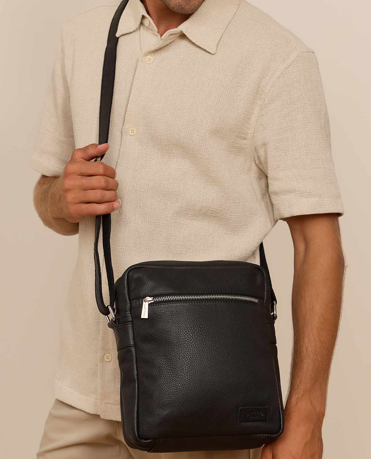 The "Rosco" shoulder bag made of high-quality black leather is the ideal companion for any occasion. Whether in everyday life, on a city stroll, or traveling – with this bag, you always opt for a timeless, elegant design. It offers ample space for your essentials and impresses with its simple yet stylish appearance. The adjustable shoulder strap ensures optimal carrying comfort and adapts to your individual needs, while the secure zipper ensures that your belongings are always well protected.