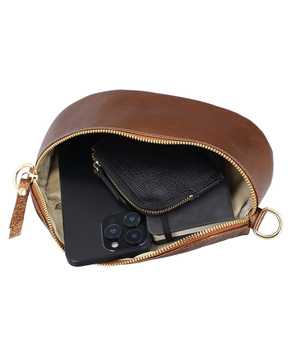 The "Brinja" shoulder bag impresses with its elegant design and high functionality. With the distinctive, semi-circular silhouette and the full zipper along the top edge, it not only offers ample space for your essentials but also security for all your personal belongings. The high-quality leather gives it a noble look that perfectly fits into your modern everyday life. Inside, you'll also find the finely embossed "Made in Italy" logo, which impressively underscores the origin and quality of this bag.