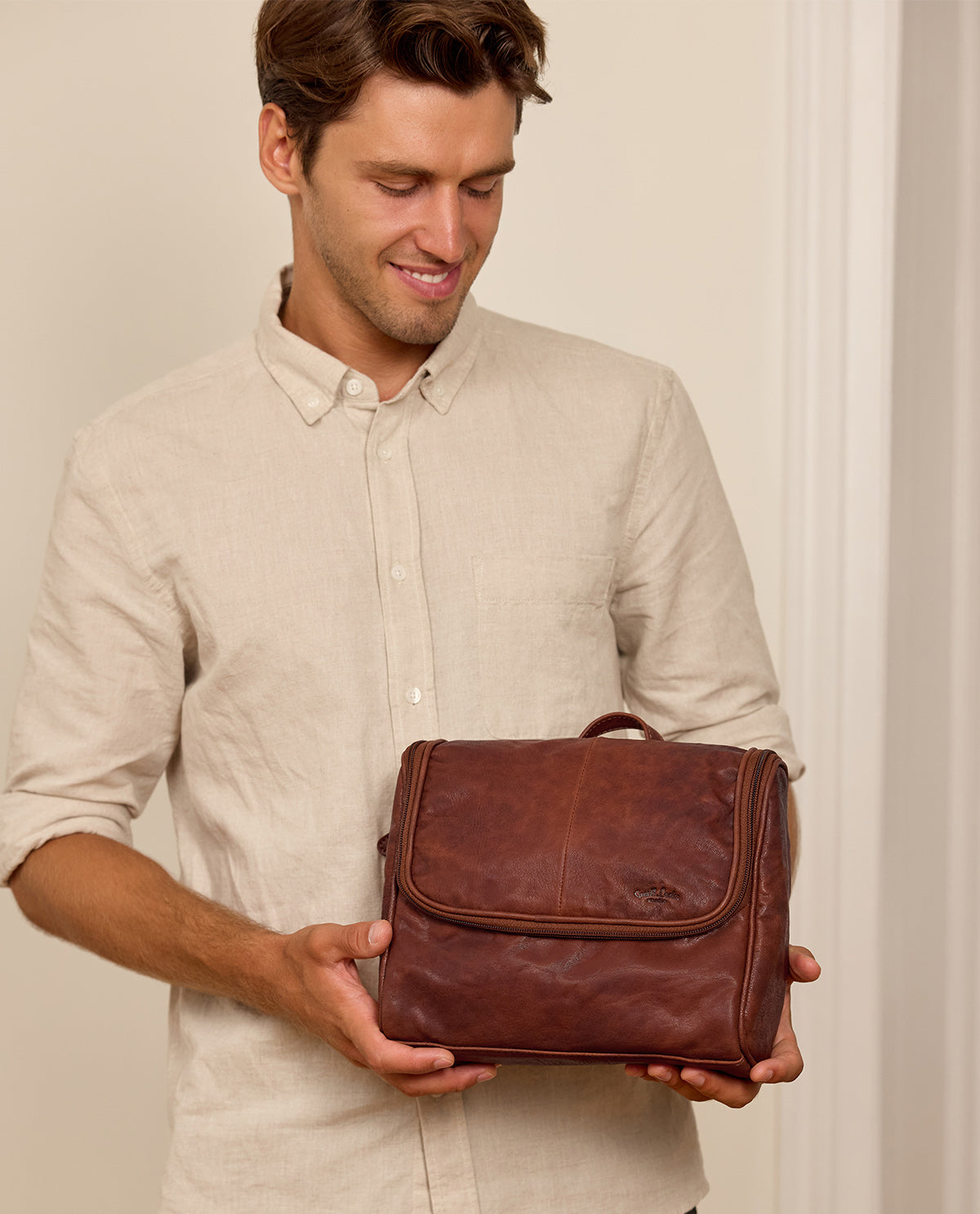 The wash bag "Aidan" perfectly combines practical use and elegant design. Made from high-quality brown leather, it not only offers an appealing look but also exceptional functionality. The bag features a large main compartment secured with a zipper, equipped with a wide opening for easy access. The water-repellent polyester lining protects your toiletries from moisture and splashes, while the inner mesh pockets with zippers ensure neat storage.