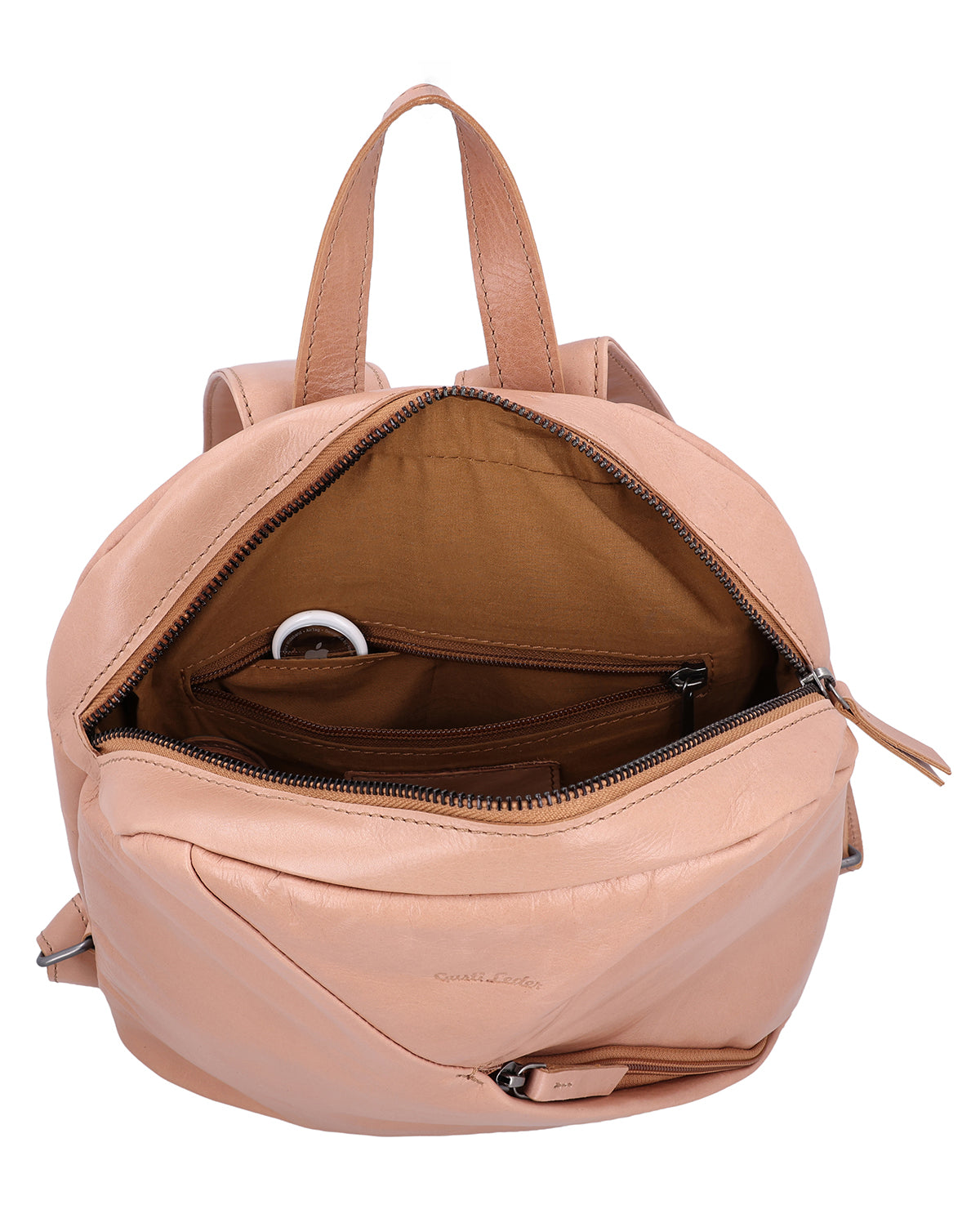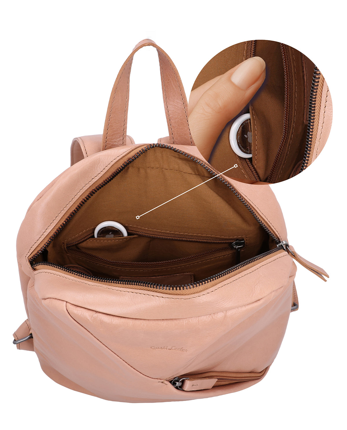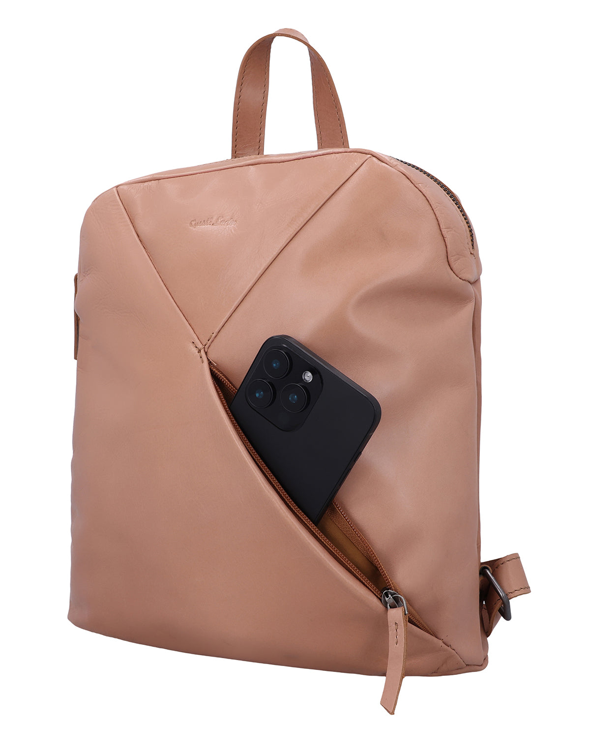 The large "Sanna" backpack is a beige leather backpack for women that will reliably accompany you through busy days—whether in everyday life, out and about in the city, or on your way to university. The hidden AirTag compartment gives you peace of mind, while the removable key ring keeps your most important essentials where you can find them immediately. One main compartment with zipper closes securely, making "Sanna" a companion that brings order and ease to your day.