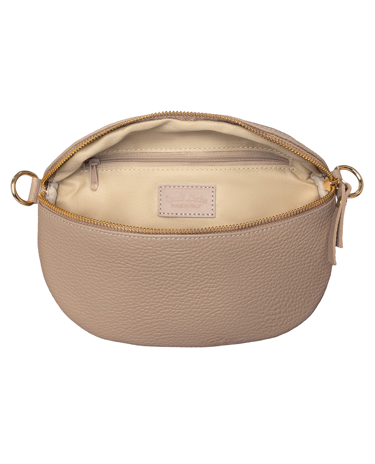 The "Brinja" shoulder bag impresses with its elegant design and high functionality. With the distinctive, semi-circular silhouette and the complete zipper along the top edge, it not only offers ample space for your essentials but also security for all your personal items. The high-quality leather gives it a noble appearance that perfectly fits into your modern everyday life. Inside, you will also find the finely embossed "Made in Italy" logo, which impressively underscores the origin and quality of this bag.