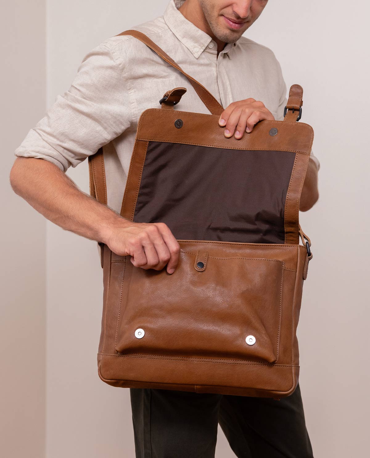 The "Attila" laptop bag made of high-quality leather is the perfect companion for your workday. It combines modern design with thoughtful functionality to transport your valuable devices safely and stylishly. With a padded laptop compartment optimally protected by a leather strap and a Velcro closure, your laptop is always securely stored. Additionally, the practical key strap in the main compartment ensures that you always have your keys within reach. Thanks to the robust material and careful craftsmanship, this bag is both durable and elegant.