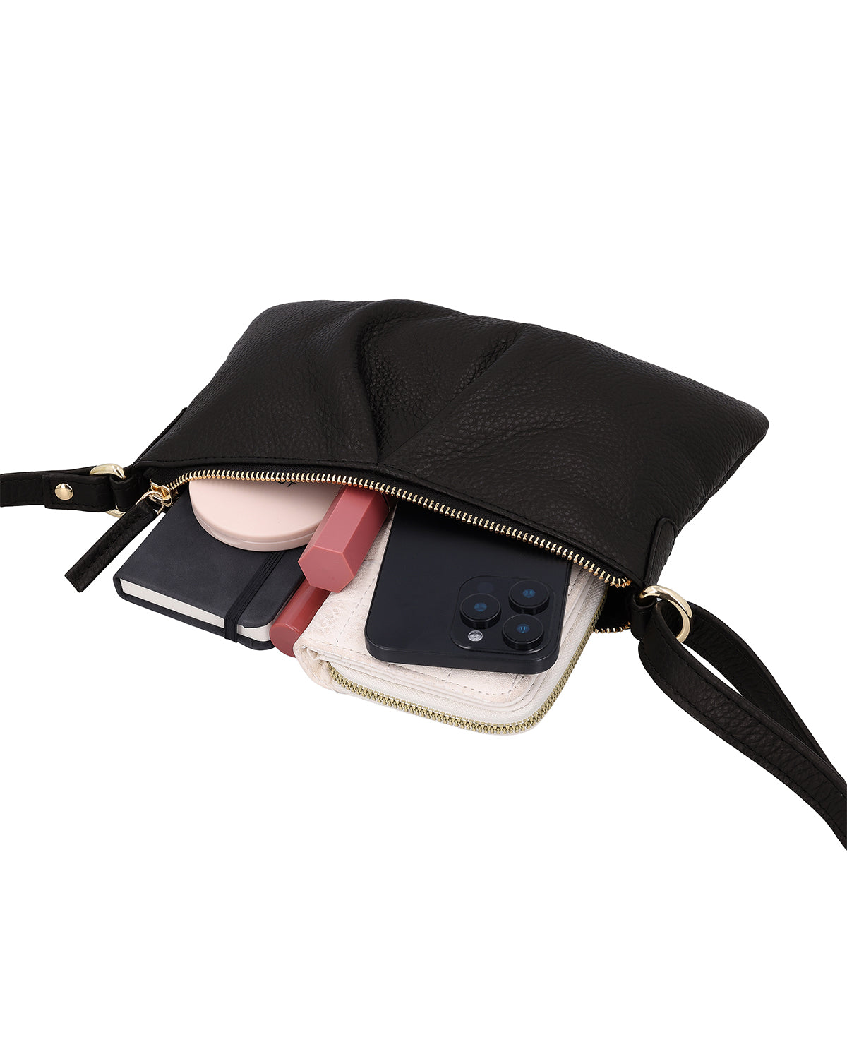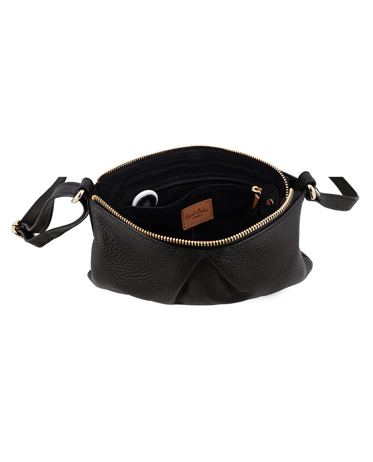 The small "Aurelie" handbag is a black leather handbag for women that combines clean lines with thoughtful functionality. A hidden AirTag compartment provides additional security, while a removable key ring keeps your most important essentials close at hand. One main compartment with metal zipper reliably protects the contents and underlines the high-quality look. Thanks to the adjustable shoulder strap, "Aurelie" can be carried flexibly – either over the shoulder or crossbody.