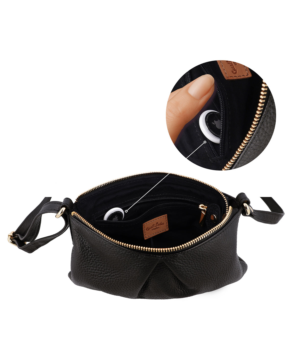 Inside, "Aurelie" offers a zippered compartment and an additional slip pocket so you can neatly store smaller items. The discreet Gusti logo on the outside stylishly rounds off the design without being obtrusive. An engraving patch allows you to personalize it. "Aurelie" is a small leather shoulder bag for women that harmoniously combines everyday practicality, security, and modern restraint.