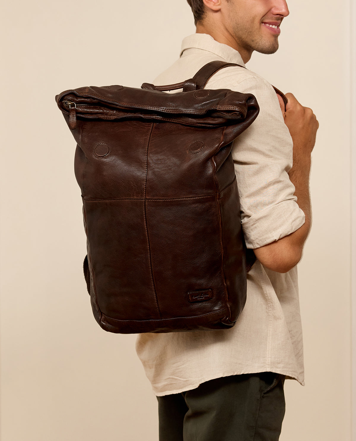 No matter if you take her to the office, university or use her in your free time, our beautiful messenger bag “Joy” will win you over in no time at all. This backpack will charm you with its versatility, comfort and spaciousness as well as its discreet and elegant design. In addition to this, the slim-cut day pack made of brown cowhide leather stands out from the crowd with its trendy roll top—a look that you just can't get away from at the moment.