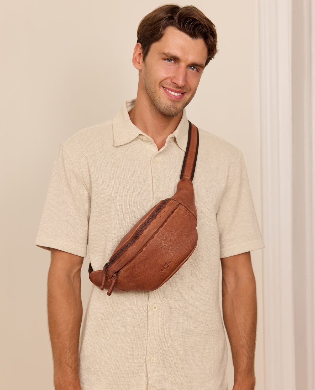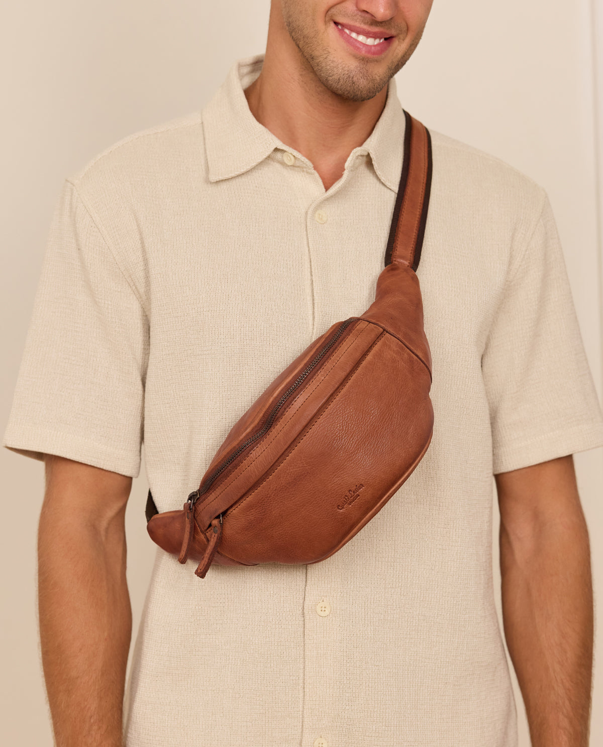 Our simple, no-fuss belt bag “Spencer” will win you over with its minimalist design, quality, and functionality. The high-quality processed cowhide leather means this belt bag is strong and sturdy. It has multiple zipped pockets where you can keep your festival essentials safe. Experienced festival-goers and concert lovers will really appreciate this bag's robustness. There's plenty of space for your wallet, phone, keys and more inside. Adjust this bag to fit you perfectly using the adjustable strap and plastic buckle. Wear “Spencer” over your shoulder or round your waist, whatever suits you. Our motto is: “Spencer” is simple. Practical. Good.