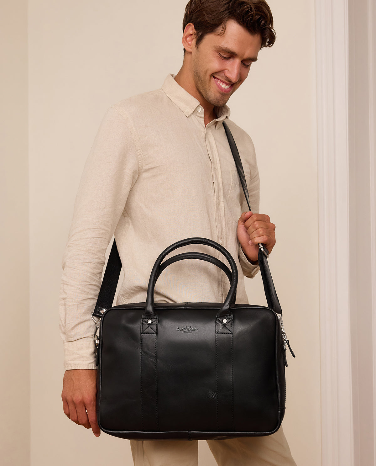 We're proud to present... “Fynn”, your new favourite leather bag. Take him to uni, the office, or the shops, our striking bag “Fynn” is everything you could want in a briefcase. He has a 15-inch laptop compartment, and pockets for your notepads and books, as well as your charger, pencil case, wallet, phone, water bottle, and keys. Take everything you need with you on your next business trip. Keep your belongings safe but easy to find thanks to the zip on the bag. Carry this briefcase in your hand or over your shoulder like a satchel using the detachable, adjustable strap. “Fynn” comes with a helpful sleeve on the back so you can slide this messenger bag onto the top of your suitcase.