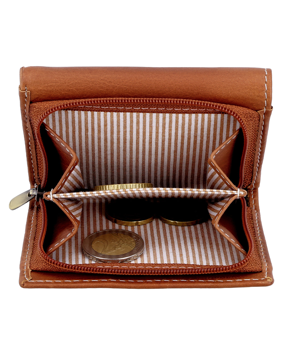 “August” will win you over with its handy size and storage space. There's space for up to 6 cards. “August” has an extra transparent slot for your ID. The coin pocket is split in two, so you can separate your coins and bills. The striped lining completes “August's” design. Use the zip and press button to secure your things inside. Take your essentials with you wherever you go. “August's” got your back!