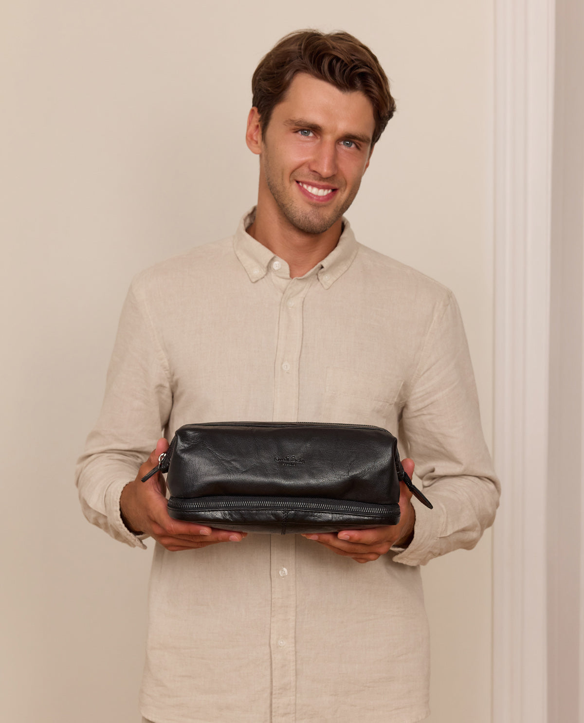 This toiletry bag is the perfect place to store your toiletries when you're travelling, it's waterproof lining makes it a must-have for your next trip. The polycotton lining will stop any spilled liquids escaping and can be easily wiped down. The large main compartment has plenty of space for your essentials. Keep your shampoo, deodorant and toothbrush safe inside. We've crafted this toiletry bag from robust buffalo leather so it's strong enough to withstand any journey. There's a small handle on the side so it's easy to carry and hang up this washbag when you're in the bathroom. Your belongings are protected by a sturdy zip. So you'll be ready for anything.