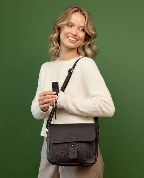 Our goatskin shoulder bags are a bit stiffer at first, but will quickly become very supple and soft with regular use . Our cowhide or buffalo leather shoulder bags, on the other hand, are somewhat more durable than goatskin bags due to their inherently stronger material. Even after some time, this leather still feels a bit firmer in texture, although these models will naturally soften as well. So decide for yourself which leather best meets your needs for your new shoulder bag.