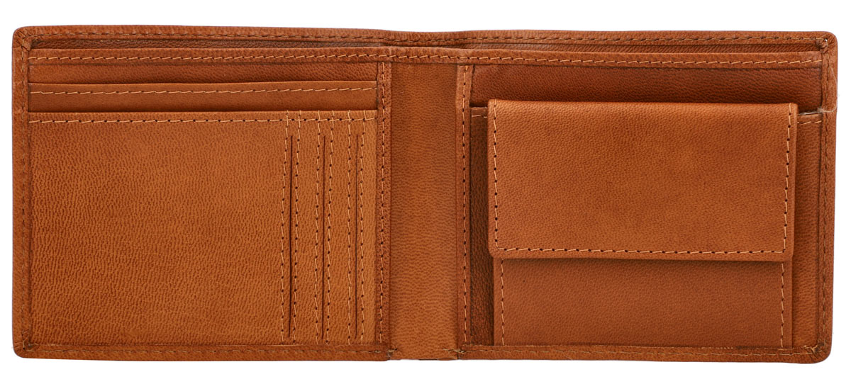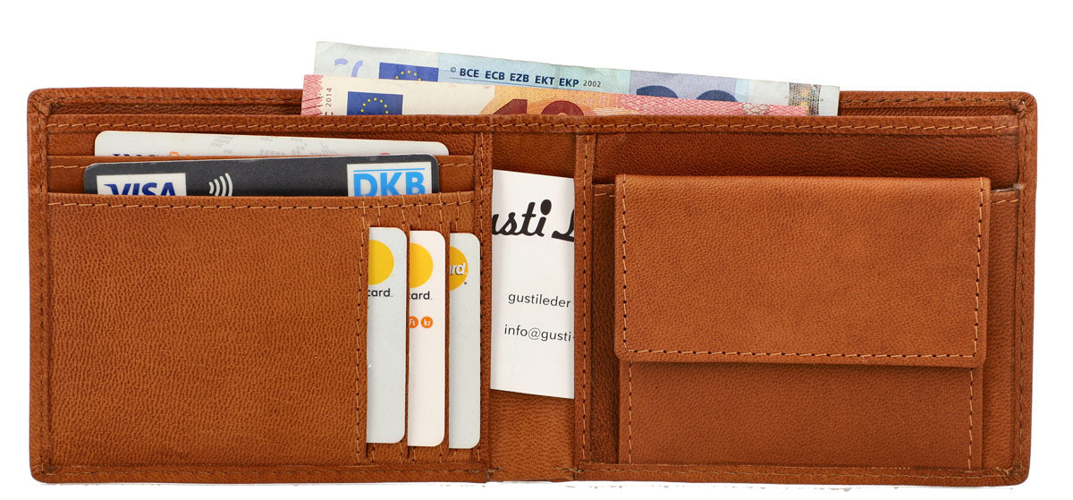 Inside, "Lawrence" impresses with its perfectly organized, no-frills structure , pared down to the essentials without compromising on functionality. It features two billfold compartments, a separate coin pocket that opens with a snap fastener and conceals one of three deep pockets, and a total of five card slots for at least as many cards. That's all it needs, and therefore "Lawrence" confidently dispenses with additional flip pockets or other features.