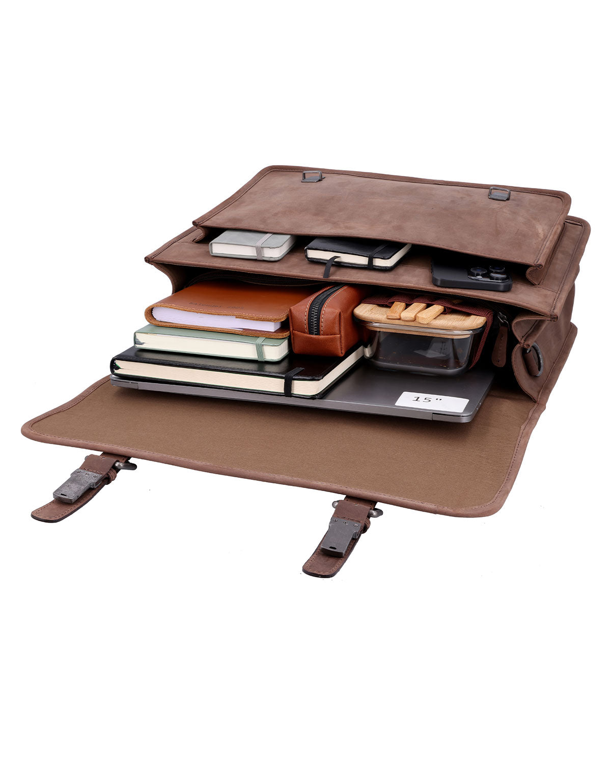 "Elmar" and its generous, centrally divided main compartment easily accommodate DIN A4 folders and document files of all kinds, as well as a planner, writing utensils, a lunch package, a small water bottle, and much more. Meanwhile, technical devices up to a size of 15" find space in a laptop compartment specially integrated into the bag design. The centrally inserted zip pocket as well as the various slip pockets and the attached pocket on the front of "Elmar" also offer the opportunity to store smaller belongings within easy reach without having to search for them for a long time. The adjustable and removable shoulder strap allows you to ideally adapt "Elmar" to your individual carrying habits, while two snap fasteners in a buckle look ensure that everything is protected from dust and moisture on the go.