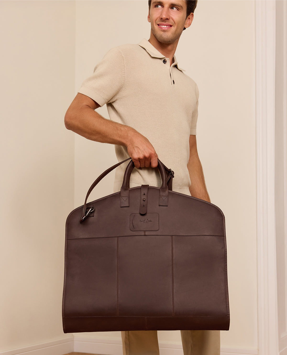 With our high-quality leather bag "Sloan" in charming vintage style, every trip becomes a stylish experience. Lightweight, handy, and thoughtfully designed, it is perfect as a companion on flights or business trips. "Sloan" offers ample space for several suits or garments, which you can conveniently leave hanging on the hanger. Two separate compartments for shoes ensure that your outfits always remain clean and separate. A long zipper allows for easy opening and filling of the bag, while sturdy carrying handles make transport particularly pleasant. Thanks to the integrated hanging hook, you can hang the bag directly in the hotel or closet - practical and space-saving at the same time. The classic retro design, rounded off by the embossed Gusti Leather logo, makes "Sloan" a timeless eye-catcher. Additionally, you can personalize it with an individual engraving - for an extra touch of individuality.
