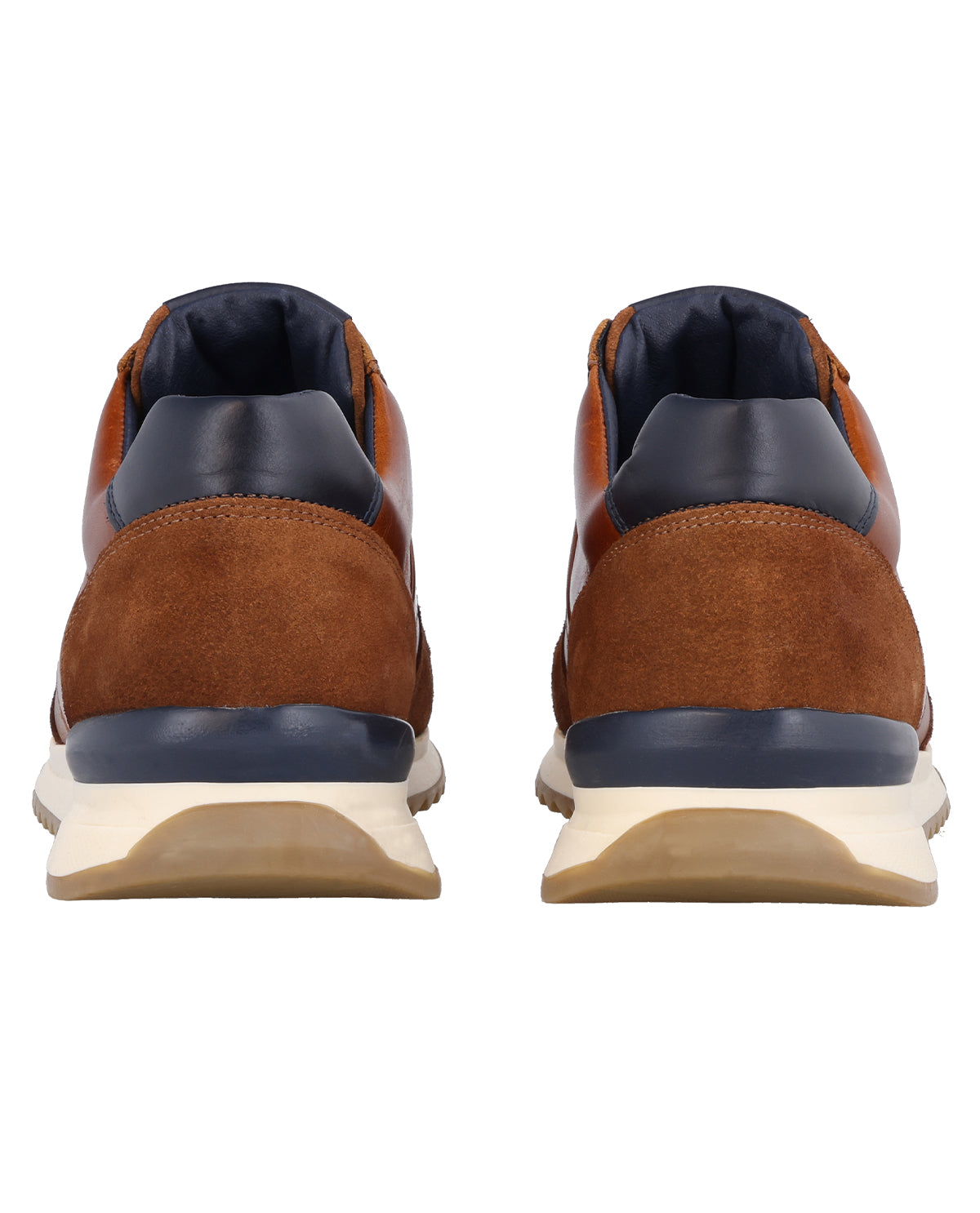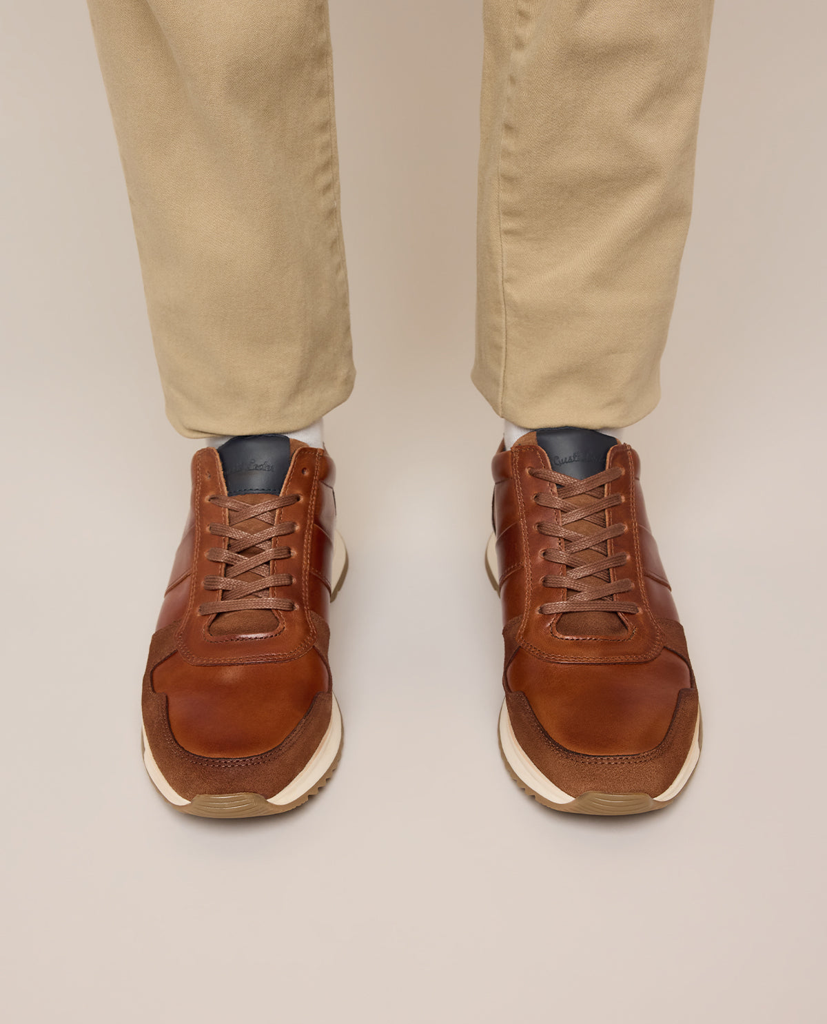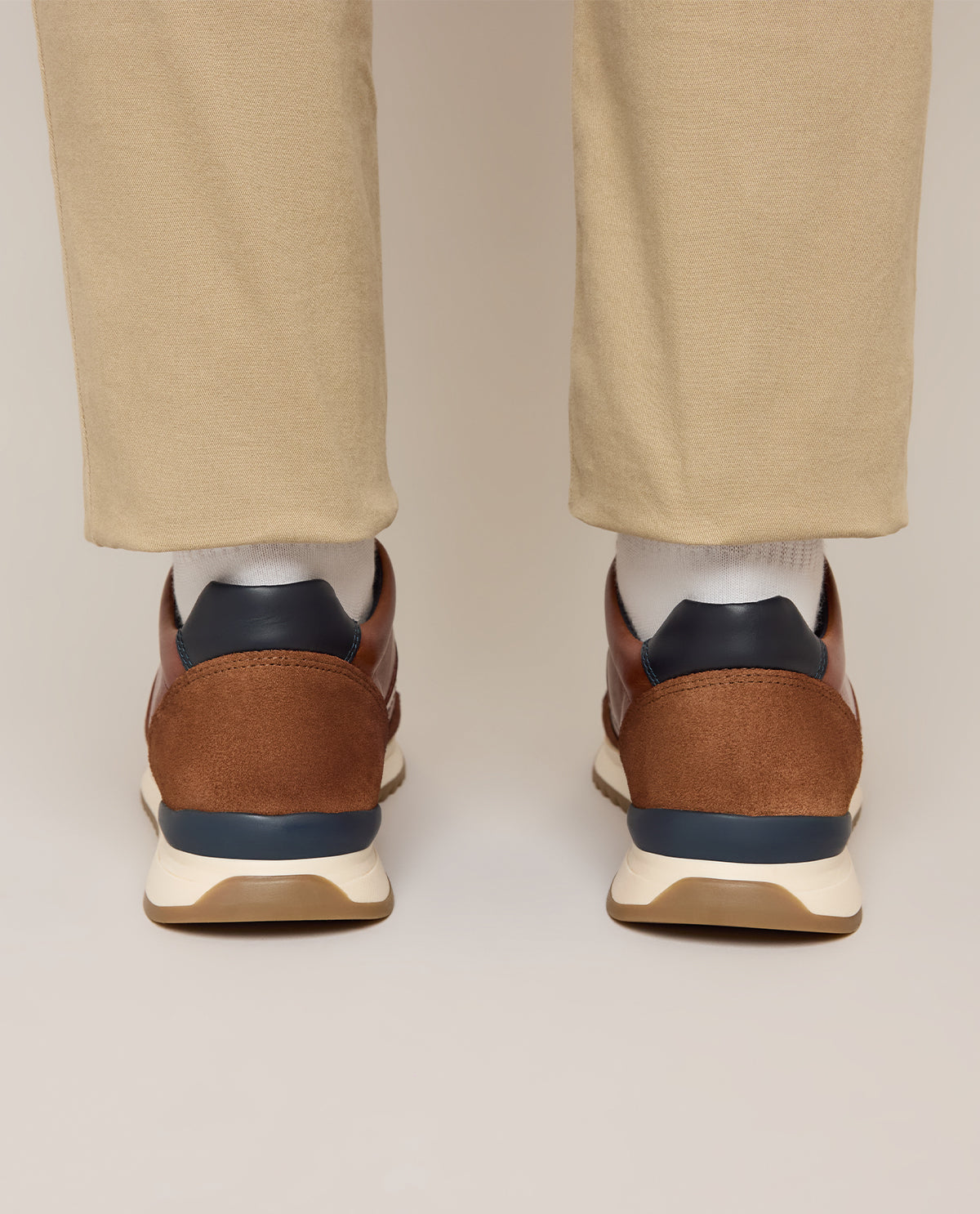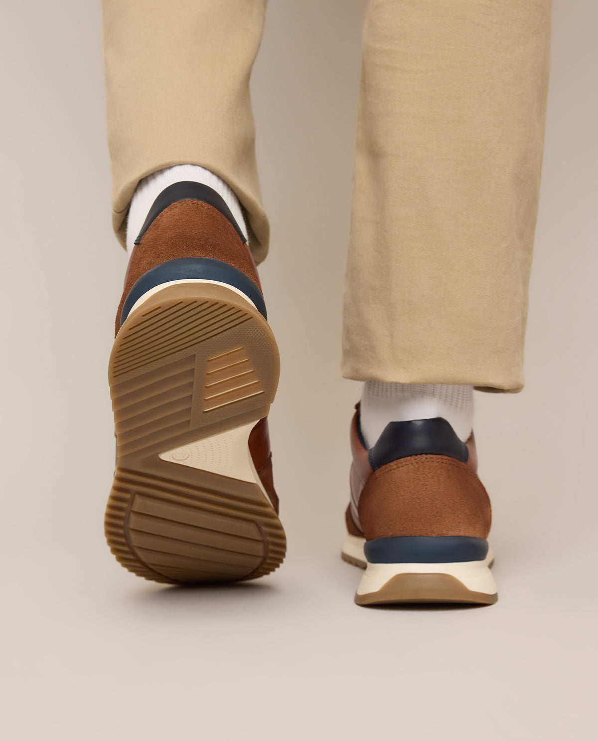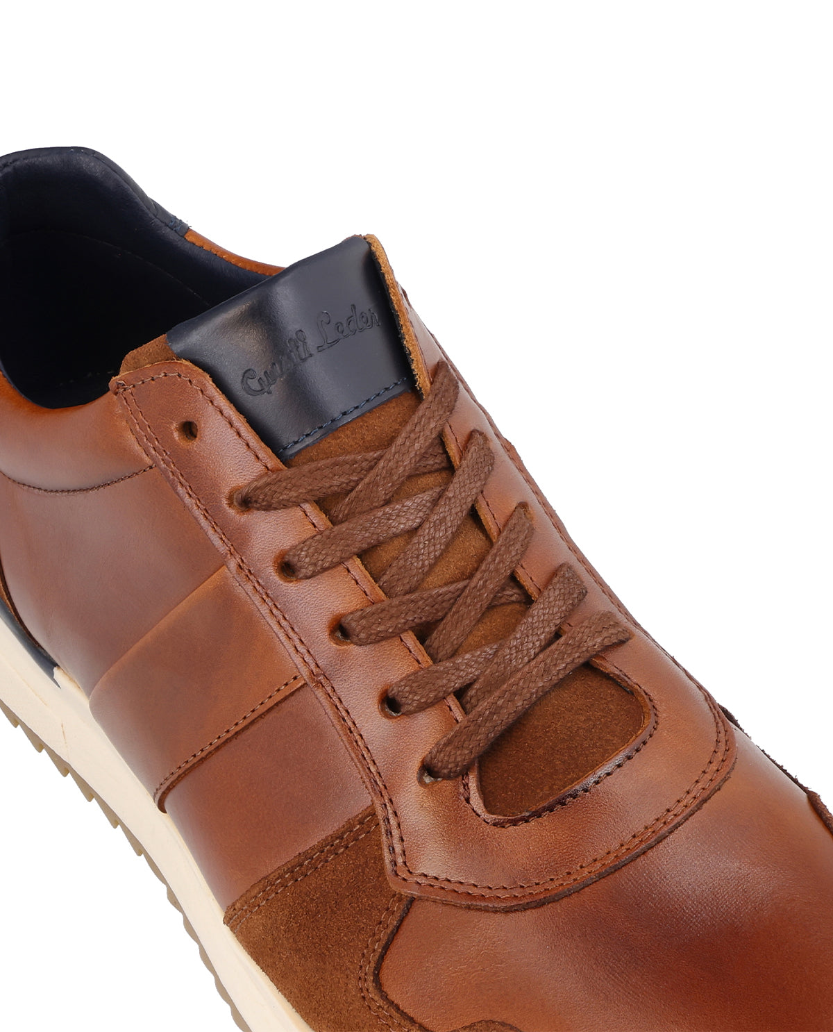 With "Ennio", you wear shoes that effortlessly bridge the gap between casual everyday life and a stylish appearance. The thoughtful design combines smooth leather with velvety suede elements, creating a sophisticated, modern look. The multi-part construction with visible seams emphasizes the craftsmanship and simultaneously guarantees durability. The rounded toe cap with a double leather layer of smooth leather and suede provides stability and visual depth, while the flat, wide cotton laces in brown add a stylish accent. The leather cover on the tongue with an embossed logo gives "Ennio" a high-quality finish.