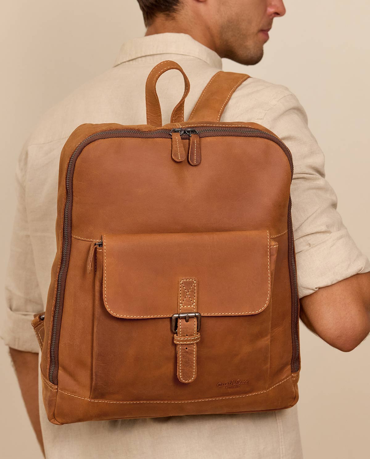 "Ove" är inte den som behöver tränga sig fram i strålkastarljuset, utan övertygar med sin raka, enkla retrocharm. Tack vare sin raka form och volym på upp till 15 liter får du här gott om plats för din 15" laptop, en favoritbok, anteckningsböcker, snacks och en vattenflaska. Väskans innertyg är av vattenavvisande material, vilket såklart är extra praktiskt och säkert. Inuti läderryggsäcken finns det flera mindre fack och fickor för att du enkelt ska kunna hålla koll på mobilen, plånboken eller alltid kunna ha en penna nära till hands. På framsidan finns ett större extrafack som försluts med med en magnet under ett metallspänne. Här får du plats med mindre nödvändigheter och tekniska enheter upp till 7,9". Och just det, hela ryggsäcken stängs med en dragkedja. Så, packa "Ove" full och ge dig ut på nya äventyr!