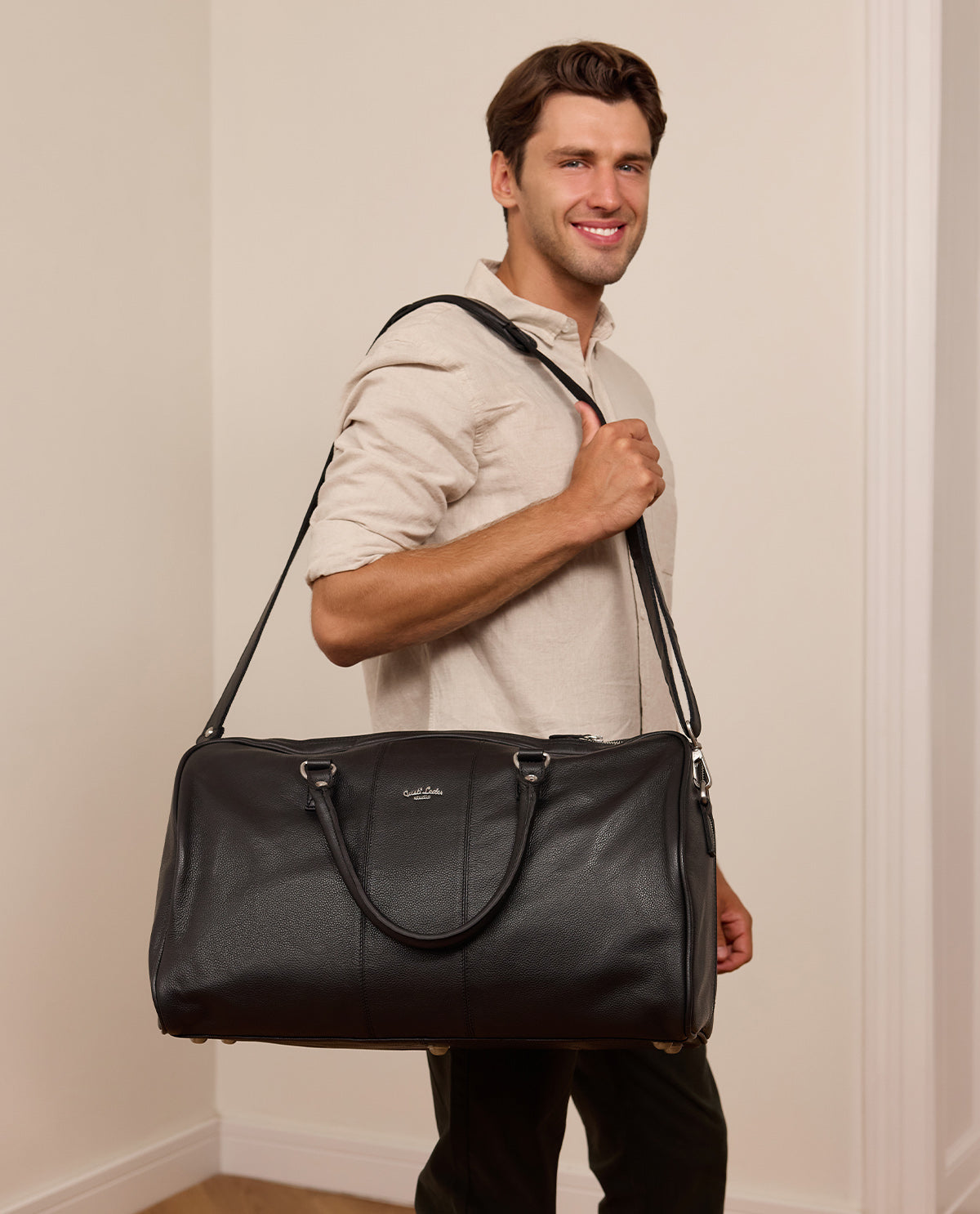 Det här är en rymlig sportbag i äkta läder som är klassiskt designad på samma gång som den är modernt bekväm. Dessutom får den plats med riktigt mycket innehåll! Med en volym på upp till 23 liter får du gott om plats för kläder, ett par extra skor, necessär och din favoritbok. Inuti weekendern finns det ett mindre innerfack med dragkedja. Hela väskan stängs även den med ett blixtlås. Den bekväma designen avrundas med två stabila bärhandtag och en axelrem som går att justera - för att du ska kunna bära "Simen" så bekvämt som du vill!
