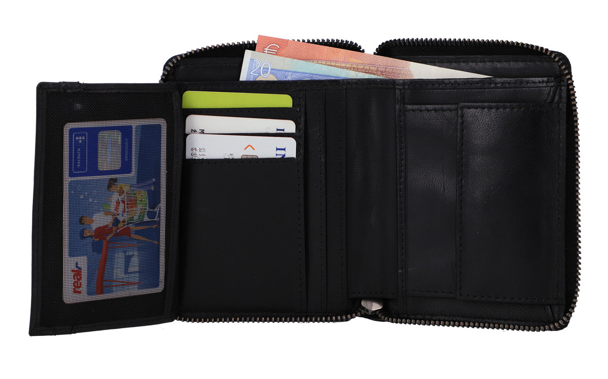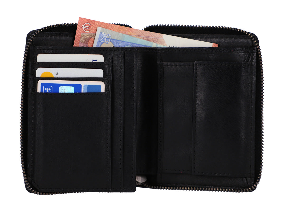 Inuti övertygar "Darian" med ett omfattande system som består av ett sedelfack, ett separat myntfack som stängs med tryckknapp och tre fack för kort. "Darian" är tillverkad av högkvalitativt garvat getskinn och är behaglig att ta på samt otroligt stabil. Pricken över i:et på "Darian" är dragkedjan som går längs med plånboken, så att inget faller ut.