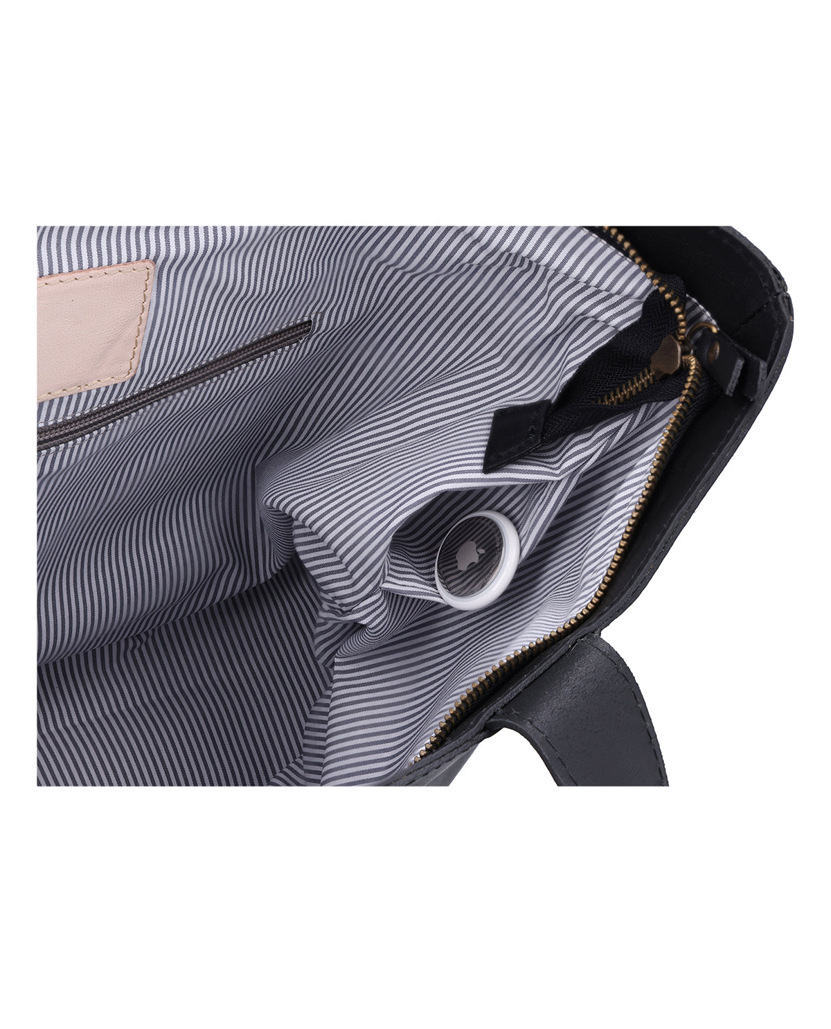 Lika stilren och diskret som utsidan är, lika genomtänkt och funktionell är insidan. Väskans inre rymmer gott om plats och förstärks av ett randigt kontrastfoder i färger som matchar lädret. Den vidöppna öppningen på "Cecilia" ger dig bästa möjliga överblick över innehållet. Oavsett om det är för picknickutrustning, A4-pärmar eller din arbetslaptop på upp till 15" – "Cecilia" hanterar det utan problem. Mindre sidofickor för mobil, pennor eller andra småsaker samt ett extra innerfack med dragkedja gör det enkelt att hålla ordning på dina saker, medan en stabil och bred dragkedja gör det nästan omöjligt för tjuvar att komma åt dina värdesaker.