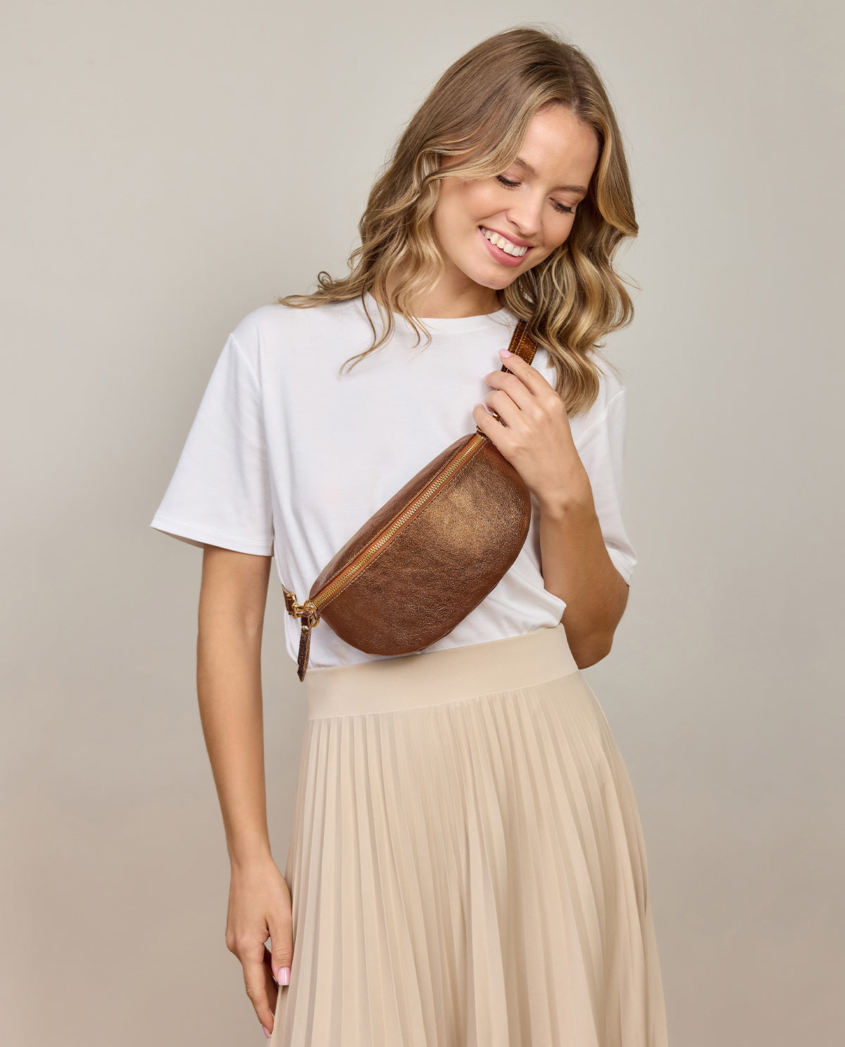 Midjeväska bumbag fanny pack crossbody väska dam brun lackläder - Made in Italy
