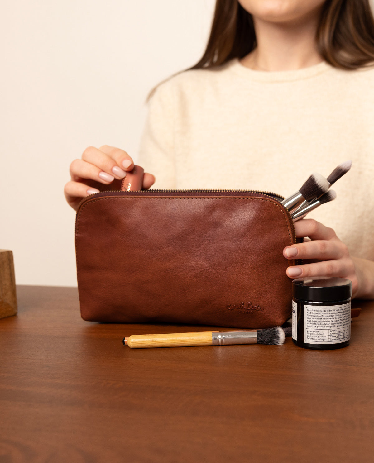 Oavsett om du är affärsresenär eller turist, på en kort resa eller som förvaring för din smink! "Eli" kombinerar funktionalitet med en avslappnad vintage-look. Det högkvalitativa buffellädret och den praktiska storleken gör inte bara att du kan organisera dina saker perfekt, utan gör också necessären till en stilfull följeslagare. Den praktiska dragkedjan och den genomtänkta designen erbjuder tillräckligt med utrymme för alla viktiga hygienartiklar, såsom deodorant, schampo, balsam, tandkräm och mycket mer. För extra vardaglig användbarhet är "Eli" utrustad med ett vattenavvisande foder på insidan – så att allt blir lättare att hålla rent. Inspirerad av Berlin är "Eli" den perfekta följeslagaren för alla som värdesätter funktionalitet och stil.