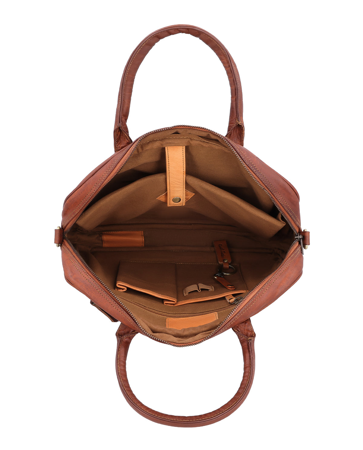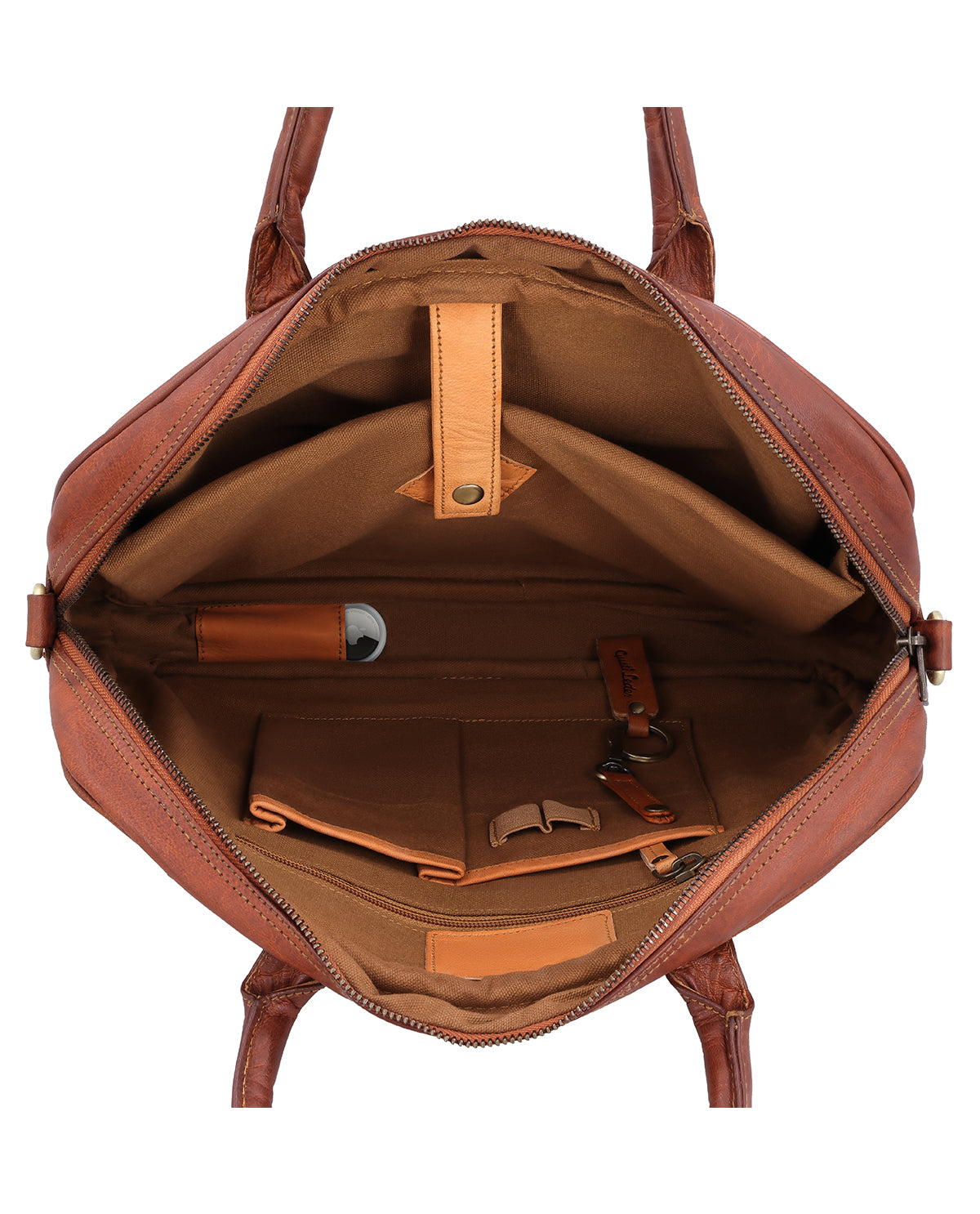 Med "Cassius" väljer du en portfölj som perfekt kombinerar elegans, funktionalitet och komfort. Den är tillverkad av högkvalitativt läder och övertygar med sina rena linjer och genomtänkta innerutrymmen. Huvudfacket med dragkedja erbjuder generöst med förvaringsutrymme, medan det vadderade laptopfacket skyddar din dator. Inuti hittar du två fickor, ett fack med dragkedja, pennfack och en avtagbar nyckelringhållare så att allt har sin plats. Ett integrerat AirTag-fack ser till att du alltid hittar din väska – perfekt för din moderna arbetsdag.